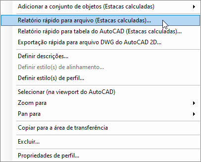 Assegure-se de que a guia de subobjeto Estacas calculadas esteja selecionada e, em seguida, clique com o botão direito do mouse no perfil selecionado e selecione Relatório rápido para o arquivo (estacas calculadas) no menu de contexto.
