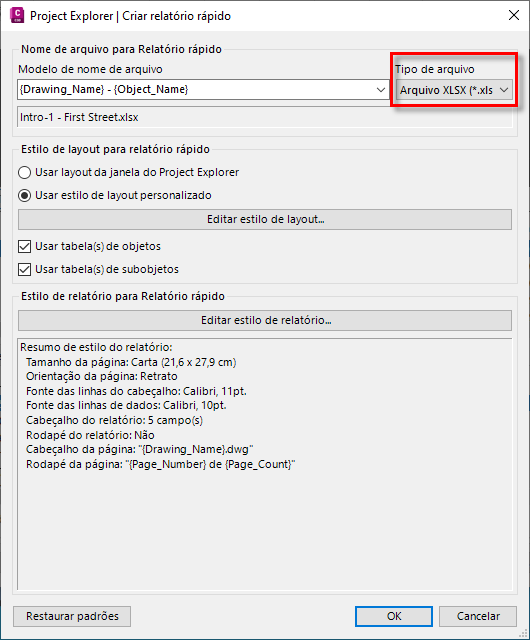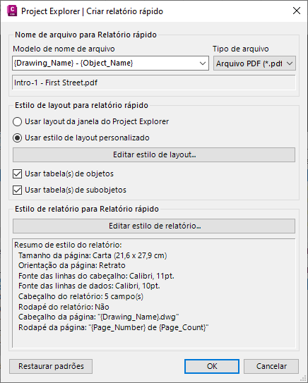 - Assegure-se de que a lista suspensa Tipo de arquivo esteja definida como Arquivo PDF. Observe que o nome do arquivo de relatório de saída pode ser derivado de uma série de variáveis dinâmicas durante o processo de criação ou é possível especificar um nome de arquivo fixo nesta caixa de diálogo. Por padrão, o nome do arquivo de relatório será composto de uma combinação do nome do desenho e do nome do objeto selecionado.