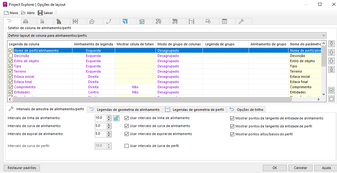 - Na vista em lista, assegure-se de que somente as primeiras sete colunas estejam selecionadas: Nome do alinhamento, Tipo, Estilo de objeto, Terreno, Estaca inicial, Estaca final, Comprimento.