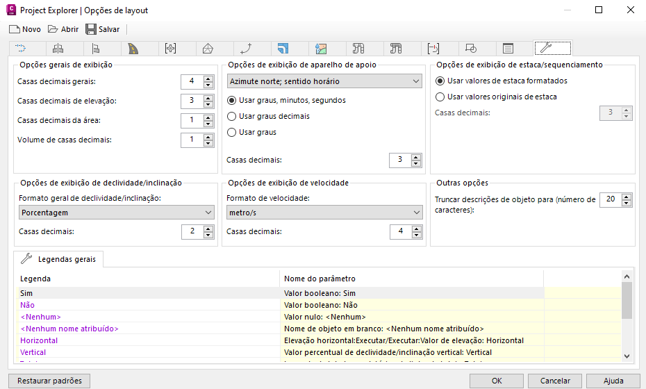 - Selecione a guia Geral e observe as opções aqui para definir o formato de valores numéricos como ângulos/aparelhos de apoio, estacas, elevações e inclinações. As alterações aplicadas aqui afetarão somente o Relatório rápido de saída.