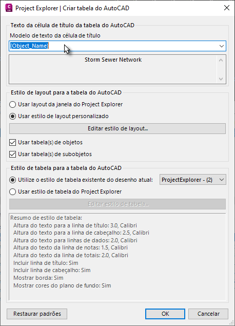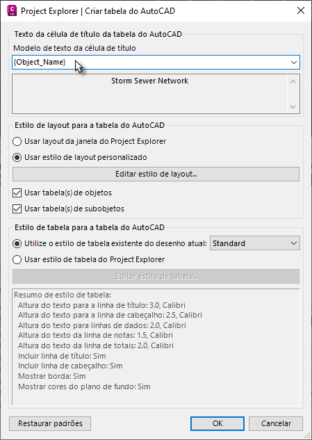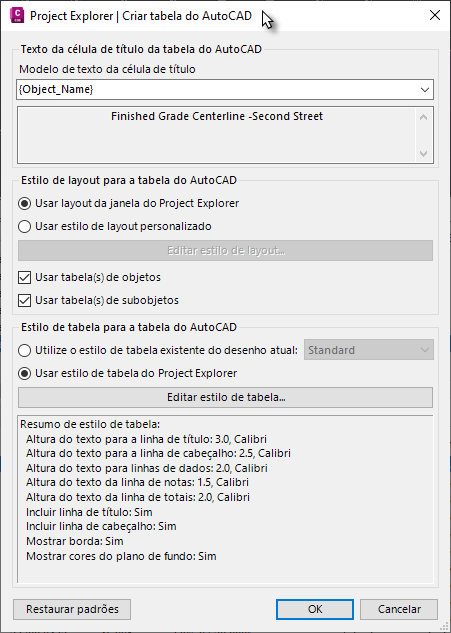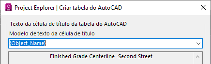 Observe que a linha de título da tabela do AutoCAD pode ser derivada de uma série de variáveis dinâmicas durante o processo de criação ou é possível especificar um nome de arquivo fixo nesta caixa de diálogo. Por padrão, a linha de título exibirá o nome do objeto selecionado.
