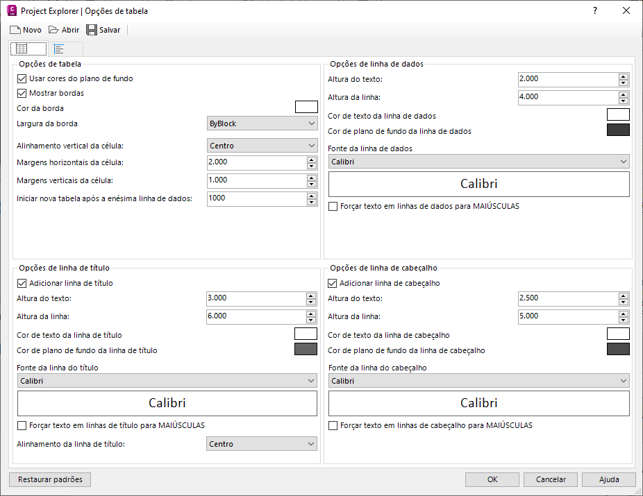 Na caixa de diálogo Criar tabela do AutoCAD, verifique se a opção UsarProject ExplorerEstilo de tabela está selecionada e, em seguida, clique no botão Editar estilo da tabela. A caixa de diálogo Opções da tabela é aberta. Esta caixa de diálogo permite definir como será a aparência da tabela.