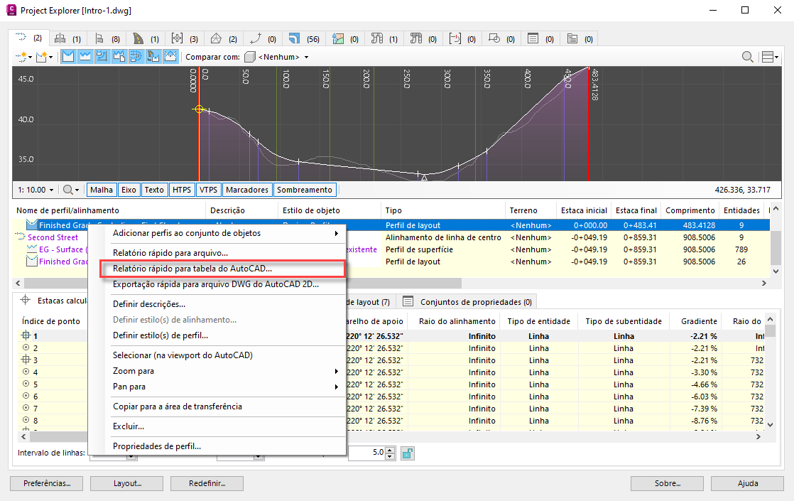 Este tutorial demonstra o uso do Project Explorer para inserir duas tabelas estáticas do AutoCAD em um desenho do Civil 3D. A primeira tabela conterá um relatório simples de alinhamento/perfil do Civil 3D. A segunda tabela conterá um relatório de trecho de tubulação derivado de uma rede de tubulação do Civil 3D.