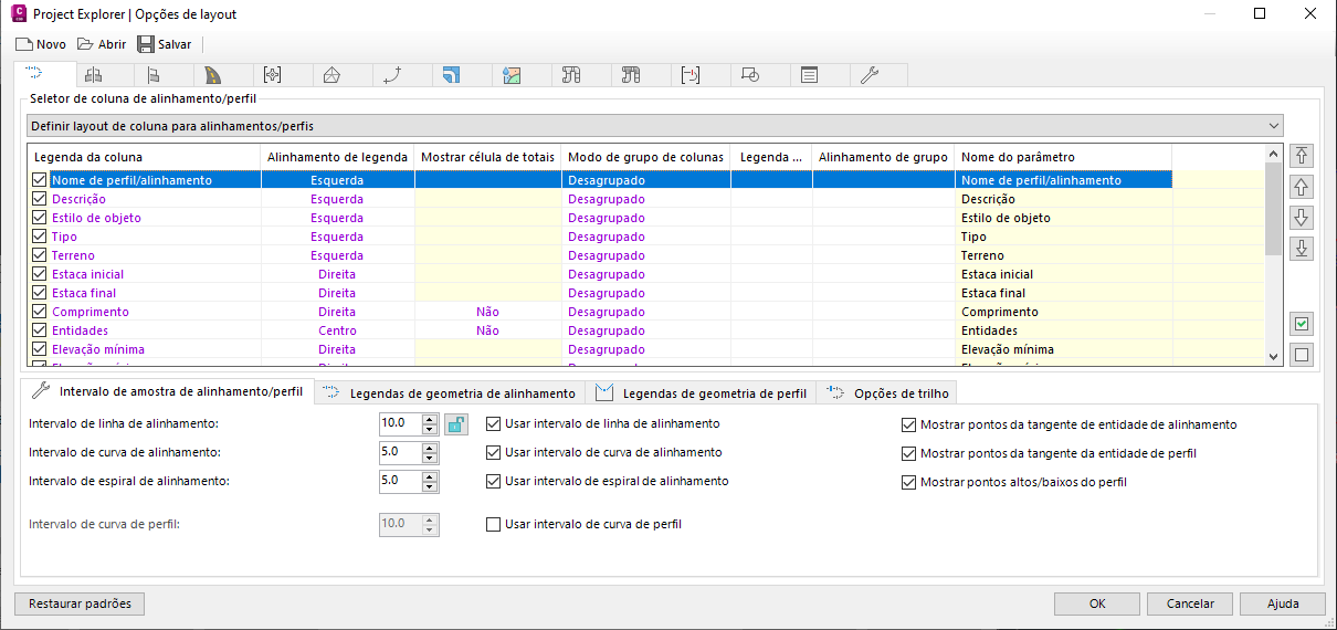 Na barra de ferramentas Gráfico do perfil longitudinal, faça as seguintes alterações de parâmetro: