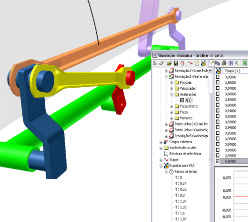 O processo inicia em Simulação dinâmica, onde você Exporta para FEA a ocorrência e as informações de intervalo de tempo. A seguir, no Ambiente da análise de tensão, defina as Propriedades da simulação para indicar quais cargas em movimento são consideradas.