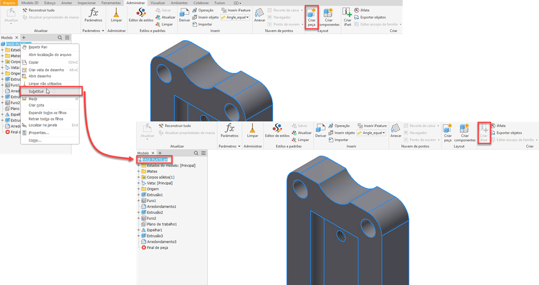 Utilize a opção "Substituto" do menu de conteúdo no nó do Navegador de peças. O nó do Navegador de peças reflete o status da peça substituta e o comando "Criar iPart" está desativado.