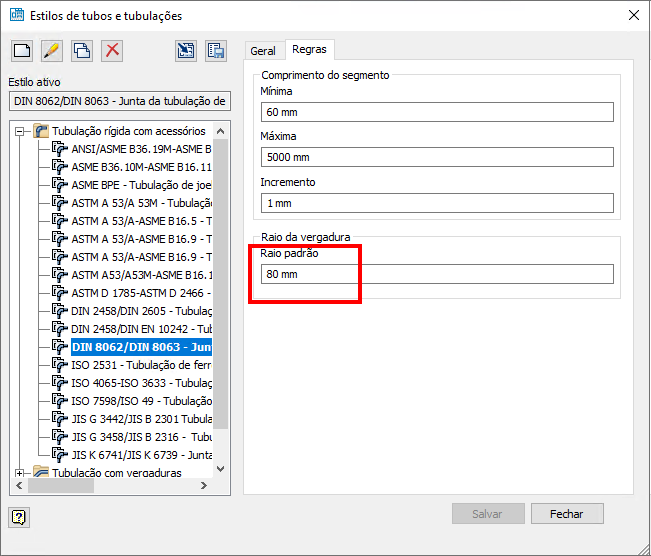 Na caixa de diálogo Estilos de tubos e tubulações, o campo de edição Raio padrão agora está disponível para todos os estilos de tubos e tubulações. O raio da vergadura padrão equivale ao dobro do valor do diâmetro nominal. O valor alterado será usado para novas dobras personalizadas. As rotas existentes com dobras personalizadas serão atualizadas para refletir o novo valor do raio da dobra.