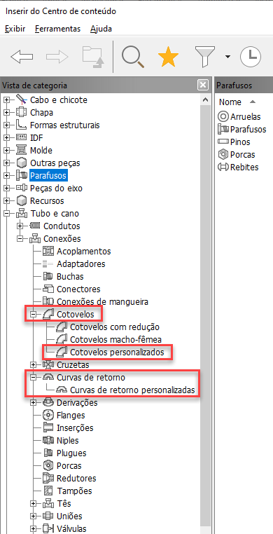 Além da biblioteca Cotovelos personalizados, a biblioteca Curvas de retorno personalizadas é adicionada. A criação e a publicação das peças de ambas são compatíveis.