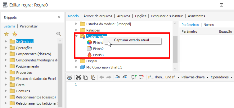 Se existirem Acabamentos no documento, o nó Acabamentos do navegador estará disponível no Editor de regras do iLogic na guia Modelo. Clique com o botão direito do mouse no nó e selecione Capturar estado atual para obter a definição. Em Montagens, selecione o nó Acabamentos para capturar todas as definições.