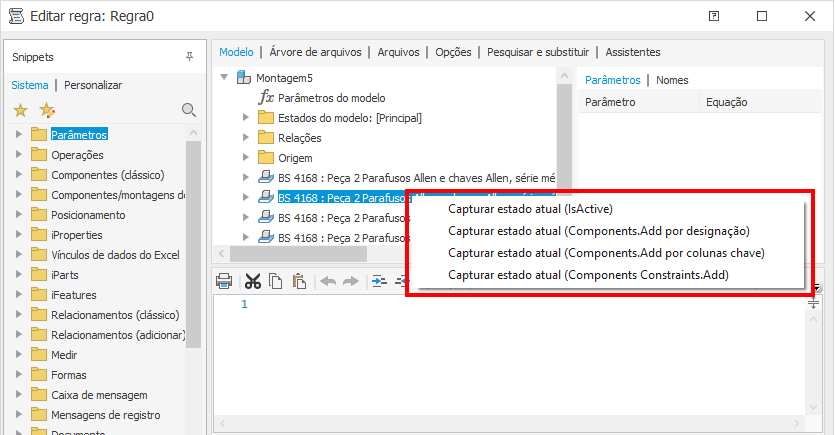 Clique com o botão direito do mouse em um componente do Centro de conteúdo no Editor de regras para exibir e usar a opção "Capturar estado atual (Components.Add por designação)" recém adicionada. Essa opção está disponível somente em montagens.