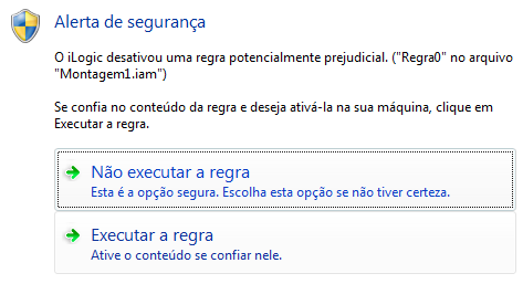 Um alerta de segurança é exibido quando você executa uma regra que o Inventor considere possivelmente perigosa. Você pode optar por executar a regra como segura ou não executar a regra.