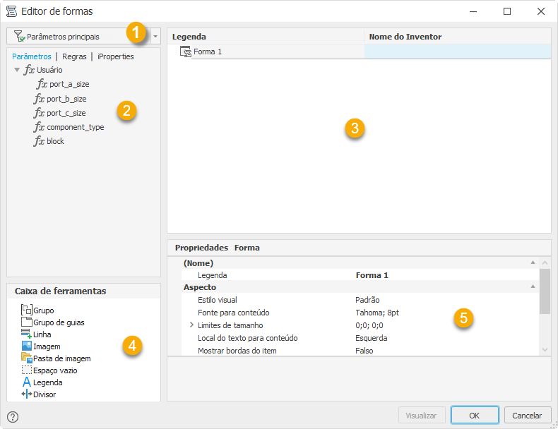 Defina as propriedades do item realçado na árvore de projeto de forma. As propriedades variam dependendo do item selecionado.