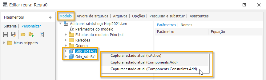- No arquivo de montagem, na guia Modelo da caixa de diálogo Editar regra, selecione os nomes de peça, clique com o botão direito do mouse e selecione Capture.Current.State (Components Constraints.Add) no menu de contexto.