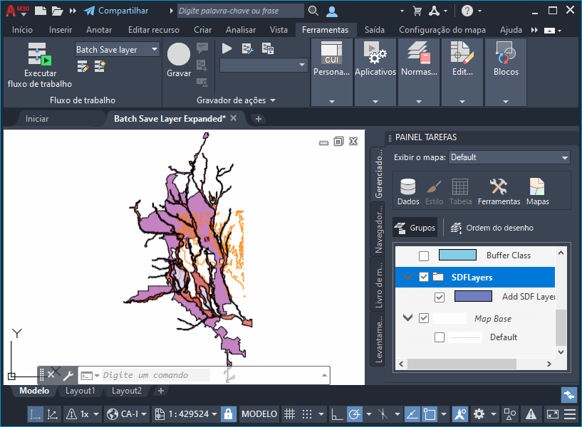 As camadas são adicionadas ao mapa, bem como para o novo grupo do Gerenciador de exibição. Será solicitado um nome e localização para o arquivo DWG. Os arquivos .layer são salvos na localização especificada na atividade.