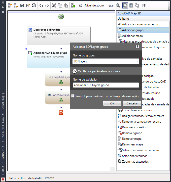 Nesta lição, você editará o fluxo de trabalho predefinido que cria camadas do Gerenciador de exibição a partir de uma pasta cheia de arquivos SDF e os salva em arquivos .layer. Você criou um grupo para manter as camadas e moveu as camadas para dentro do novo grupo.
