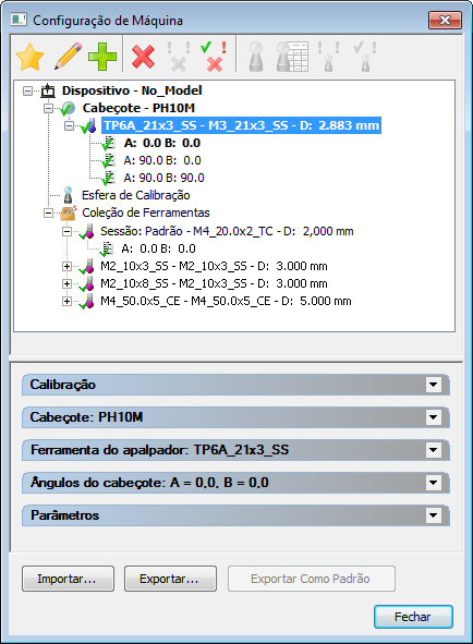 Para exibir e gerenciar a base de dados de apalpador e exibir os detalhes de configurações CMM, clique na guia Ferramentas > painel Máquina > Apalpadores. Os detalhes do apalpador utilizado e suas calibrações atuais são exibidos no diálogo Configuração de Máquina.
