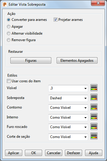 As opções da área Estilos definem o estilo das linhas visíveis e ocultas: