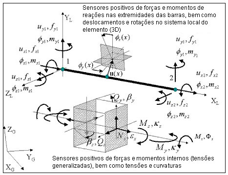 No sistema local do elemento e na faixa geometricamente linear, as tensões generalizadas e no nível da seção transversal são as seguintes (o símbolo
