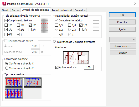 Selecione a guia Tela soldada na caixa de diálogo Padrão de armadura para definir a colocação da tela soldada.