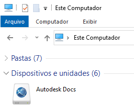 Após a instalação do Desktop Connector, será exibida a unidade conectada do Autodesk Docs. É possível usar essa unidade conectada para vincular ou abrir tipos de arquivos suportados no Revit.