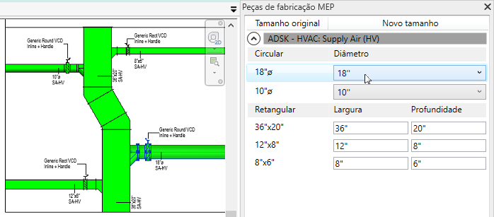Quando você move o ponteiro do mouse sobre o tamanho de uma peça na paleta Peças de fabricação MEP, o sistema de tubulação, sistema de duto ou contenção correspondente é realçado na área de desenho.