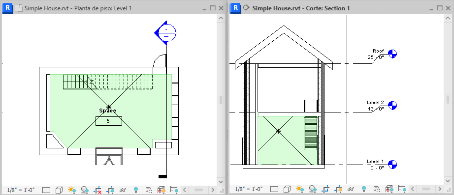 - Feche todas as vistas, exceto a vista de corte e a planta de piso onde deseja colocar o espaço, e digite w t no teclado para colocar as duas vistas lado a lado.