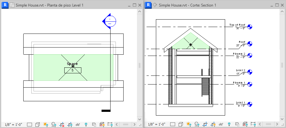 - Feche todas as vistas, exceto a vista de corte e a planta de piso onde deseja colocar o espaço, e digite w t no teclado para colocar as duas vistas lado a lado.