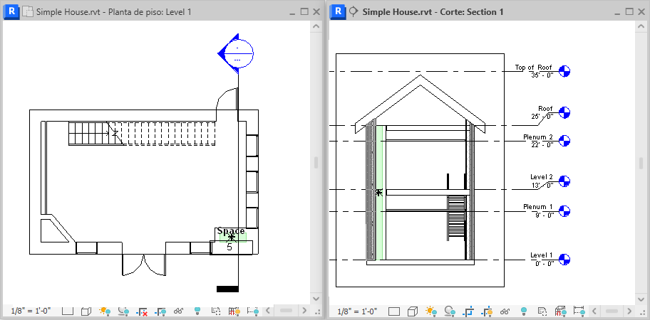 - Feche todas as vistas, exceto a vista de corte e a planta de piso onde deseja colocar o espaço, e digite w t no teclado para colocar as duas vistas lado a lado.
