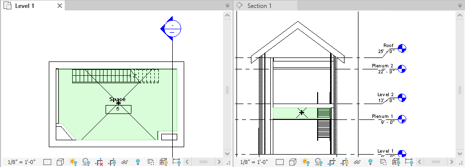 - Feche todas as vistas, exceto a vista de corte e a vista de planta de piso do nível do plenum, e digite w t no teclado para colocar as duas vistas lado a lado.