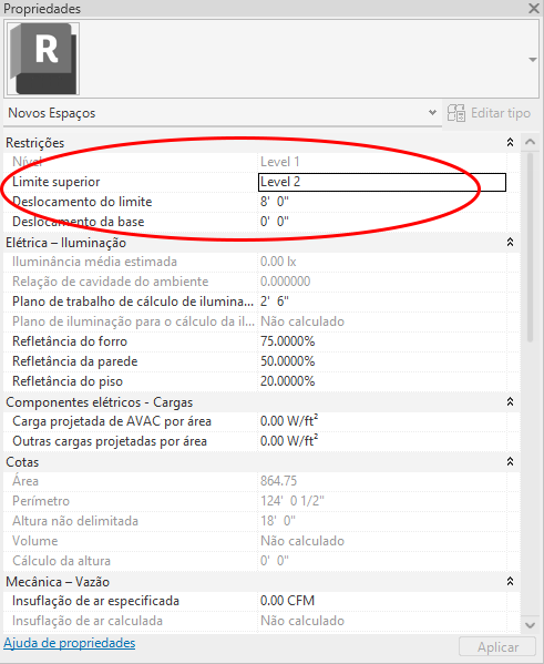 Se a extensão vertical estiver além de um elemento de delimitação de ambiente, como um piso ou teto, o espaço efetuará o snap para o elemento de delimitação de ambiente. No entanto, os controles de arraste e as cotas interativas indicarão a extensão vertical especificada, como mostrado abaixo.