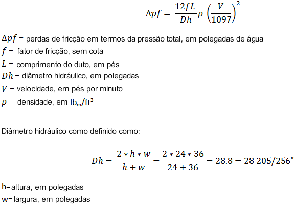O exemplo a seguir mostra como o Revit calcula a queda de pressão para um segmento de 100 pés de duto retangular de 36" x 24" suportando um fluxo de ar de 12.000 CFM.