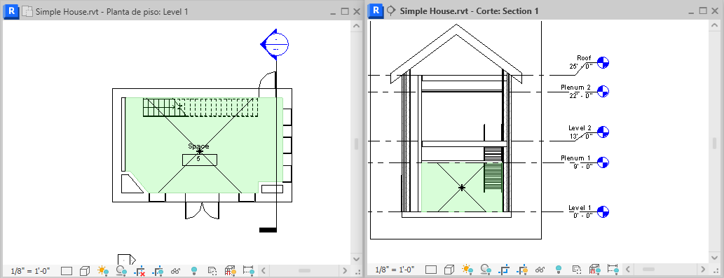 - Feche todas as vistas, exceto a vista de corte e a vista de planta de piso onde deseja colocar o espaço, e digite w t no teclado para colocar as duas vistas lado a lado.