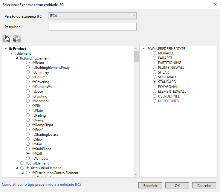 Uma caixa de diálogo ajuda a mapear entidades IFC e tipos predefinidos para instâncias e tipos de família. A caixa de diálogo permite selecionar o esquema IFC e, em seguida, pesquisar entidades IFC específicas. Selecione as entidades e os tipos na caixa de diálogo para serem aplicados aos parâmetros nos elementos do modelo. A mesma caixa de diálogo é usada para controlar as entidades incluídas nas exportações IFC. Consulte Especificar entidades IFC para famílias.