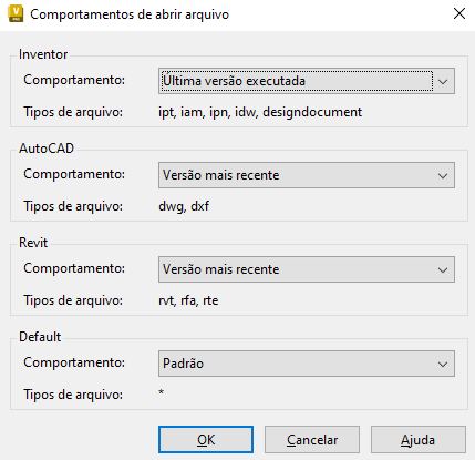 - Permite determinar se o Inventor, o AutoCAD e os arquivos do Revit são abertos com a versão mais recente, a última versão ou a versão do aplicativo de CAD que salvou o arquivo.