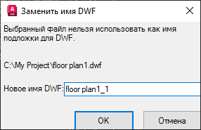 Имена вставляемых ссылок DWF или DWFx должны быть уникальными. Попытка вставить две ссылки DWF или DWFx с одним и тем же именем приводит к выводу на экран диалогового окна "Замена имени DWF".