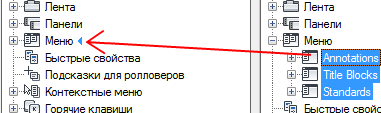В левой панели щелкните на знаке "плюс" (+) рядом с узлом элементов интерфейса, чтобы открыть список. Откройте соответствующий список в правой панели.