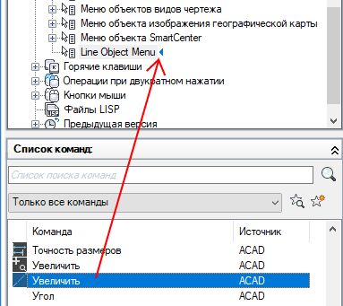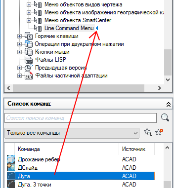 Чтобы вставлять параметры меню, относящиеся к активной команде в контекстном меню, необходимо использовать псевдоним COMMAND_имя_команды. Текст имя_команды может являться именем любой команды. Например, если требуется отображать опции меню в контекстном меню при работе с командой ОТРЕЗОК, можно использовать псевдоним СТРОКА_ОТРЕЗОК.