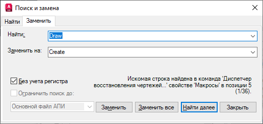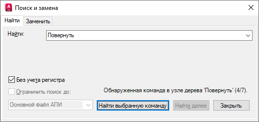 Отобразится сообщение с подробной информацией о местонахождении команды, ее точном положении на панели "Адаптации" или "Свойства", а также о количестве вхождений команды.