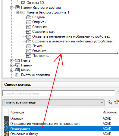 3. Под панелью "Список команд" перетащите команду или элемент управления, который требуется добавить к узлу панели "Быстрый доступ" на панели "Адаптации <имя файла>".