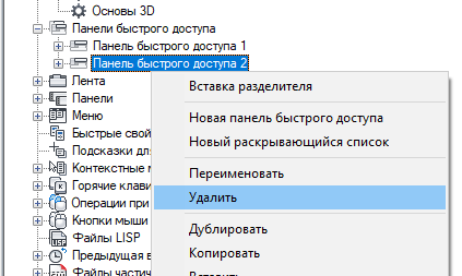 Новая панель быстрого доступа (с именем "Панель быстрого доступа1") помещается в конец списка узла панелей быстрого доступа.