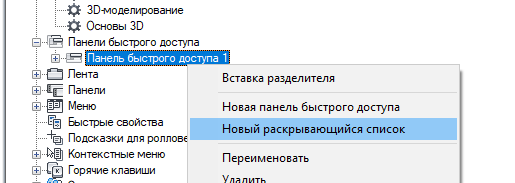 1. На вкладке "Адаптация" на панели "Адаптации <имя файла>" разверните узел "Панели "Быстрый доступ", щелкнув знак "плюс" (+) рядом с этим узлом.