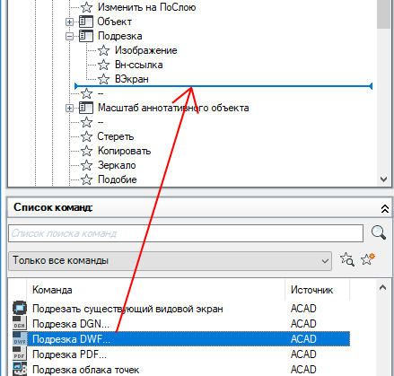 1. На вкладке "Адаптация" панели "Список команд" найдите команду, которую требуется добавить, и перетащите ее на элемент интерфейса пользователя в панели "Адаптации <имя файла>".