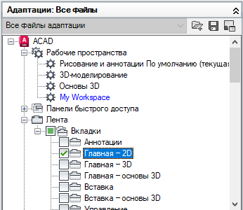На вкладке "Адаптация" разверните на панели "Адаптации <имя файла>" узел "Рабочие пространства", щелкнув на знаке "плюс" (+) рядом с этим узлом.