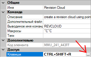 - На панели "Свойства" нажмите кнопку […] в поле "Клавиши", чтобы открыть диалоговое окно "Клавиши быстрого вызова".
