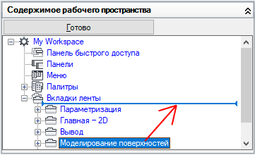 - На панели "Компоненты рабочего пространства" щелкните на значке "плюс" (+) рядом с узлом "Вкладки ленты", чтобы развернуть его.