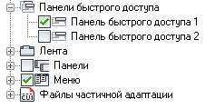 - На панели "Адаптации <имя файла>" разверните узел "Панели "Быстрый доступ", щелкнув знак "плюс" (+) рядом с этим узлом.