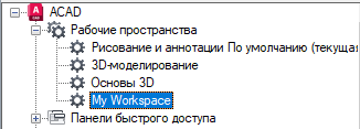 - На вкладке "Адаптация" разверните на панели "Адаптации <имя файла>" узел "Рабочие пространства", щелкнув на знаке "плюс" (+) рядом с этим узлом.