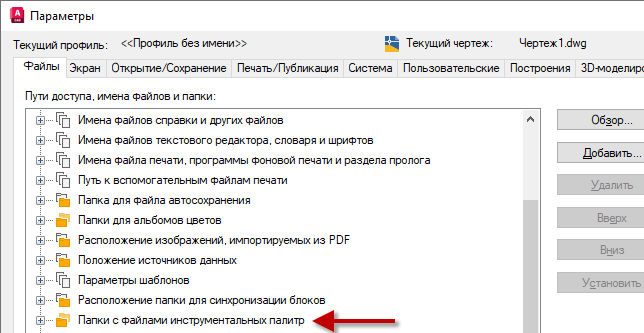 Файлы инструментальных палитр содержат стандартные и пользовательские инструменты. Файлы сохраняются в директориях, указанных в параметре "Местонахождение файлов инструментальных палитр".