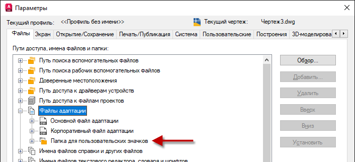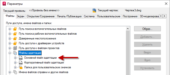 Пользовательские профили являются именованными коллекциями приложения и настройками среды чертежа. Эти настройки включают в себя цвет окна чертежа, размер курсора, шрифт окна команд, орфографический словарь и т. д.