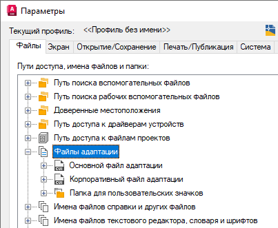 - На вкладке "Файлы" диалогового окна "Параметры" щелкните на знаке "плюс" (+) рядом с узлом "Файлы адаптации", чтобы развернуть его.